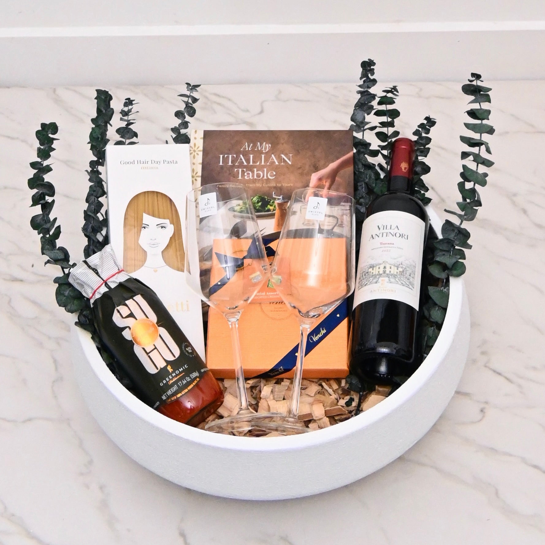Paired with the book is a bottle of Villa Antinori Italian red wine, known for its balance, depth, and classic Tuscan character—perfect for both everyday enjoyment and special occasions. Two elegant wine glasses invite shared moments, whether over a homemade meal or a relaxed evening in.